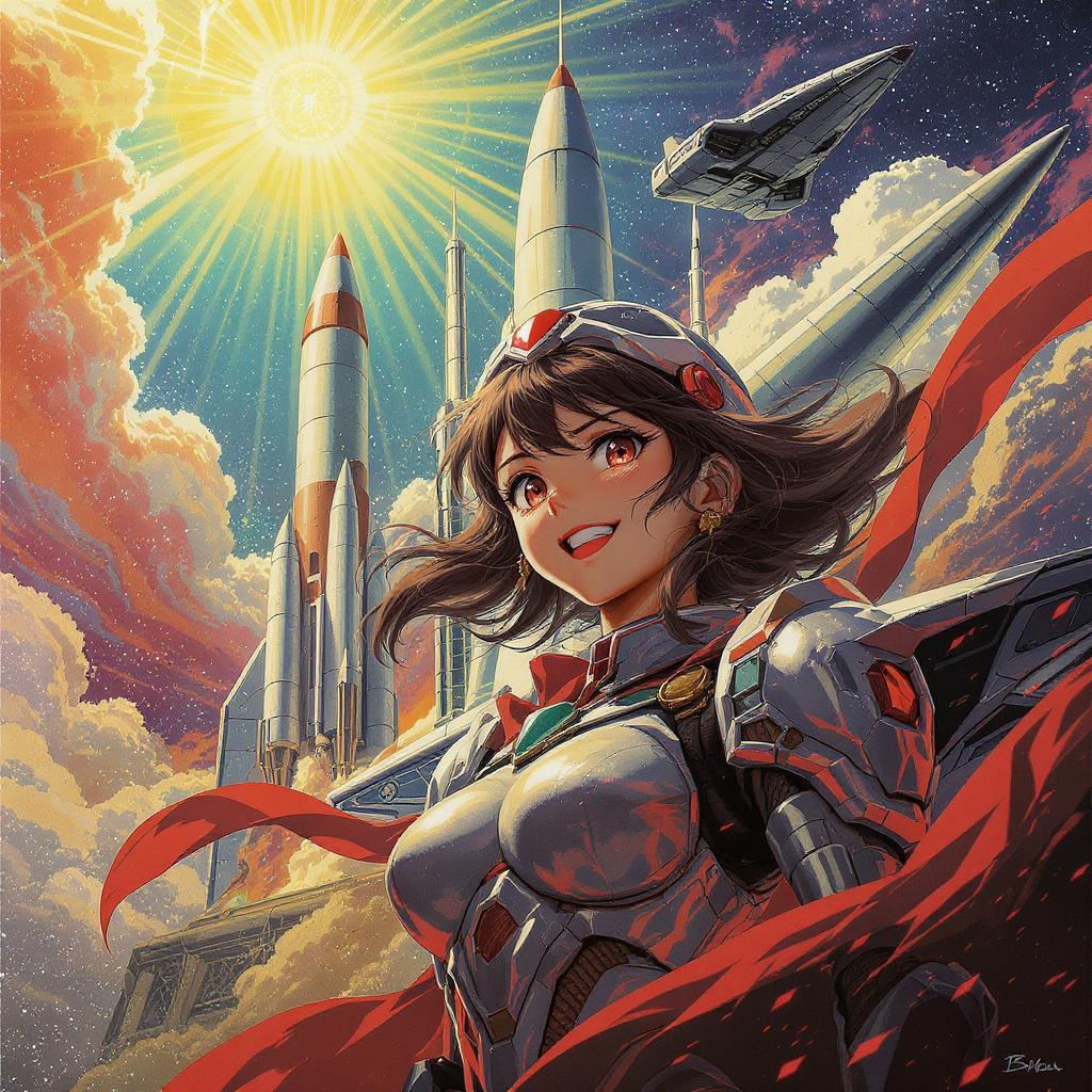 young girl in futuristic armor, reminiscent of retro soviet art, with a towering rocket and sleek spaceship behind her, bathed in bright sunlight, anime and manga-inspired visuals, rich dark tones, high-detail offset printing, vibrant poster, high definition 8K quality, CMYK color palette, joyful expression, natural light, vertical composition with a 9:16 aspect ratio