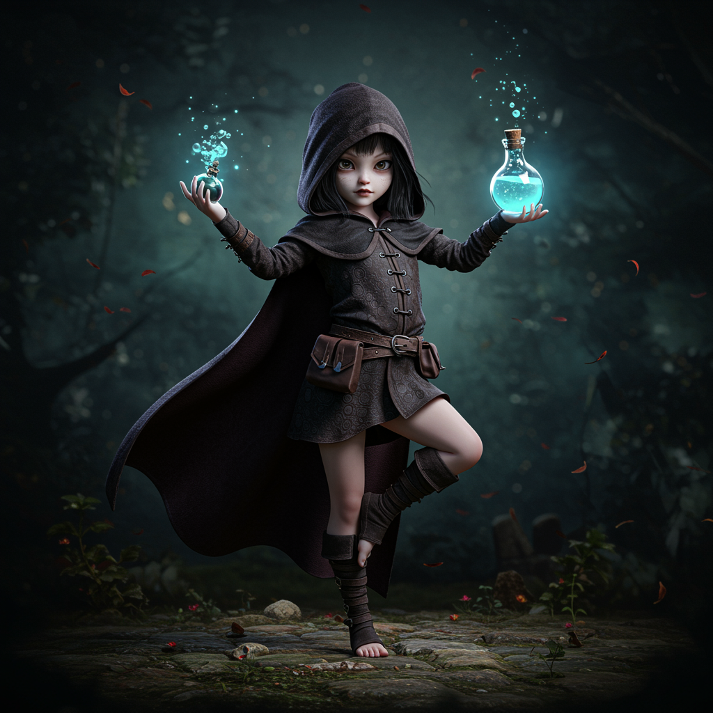 A mysterious young girl with a touch of the eerie, resembling a little wizard, stands poised in a whimsical dance, her full body in a mesmerizing pose as if captured in slow motion. She is draped in a dark, intricately patterned leather cloak that exudes an aura of ancient magic. In her delicate hand, she conjures a shimmering, dangerous-looking potion, the bottle seemingly alive with a toxic glow. The setting is a dark and moody universe, with an insanely detailed and bloom-filled atmosphere, rendered in the highest quality digital art. Her face and eyes, strikingly detailed with sharp features and intricate pupils, convey an almost otherworldly wisdom. The piece is a masterpiece of digital design, showcasing an 8k photorealistic style with impeccable sharpness. The girl's form is rendered with perfect anatomical accuracy, enhanced by realistic and intricate shadows, reflecting the flawless work of 3D artistry. The style hearkens to the visionary art of Chao Teng Zhao, encapsulating best quality and highly detailed photo-like realism.