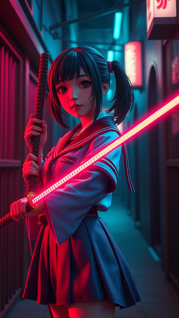 Young Japanese high school girl with a vibrant school uniform poised with a glowing katana in a shadowy alley, cinematic atmosphere, stunning 3D render utilizing unreal engine, ultra high resolution, aspect ratio 9:16, embracing an expressive and dynamic style with an air of mystery and strength, subtle hints of neon lighting illuminating her surroundings.