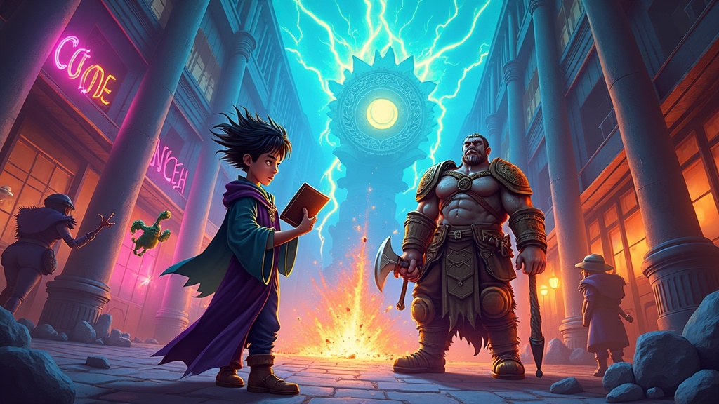 A young mage, engrossed in a spellbook, stands beside a formidable barbarian warrior in a vibrant, magically charged city street. Neon lights and arcane energy illuminate the dramatic fantasy scene, blending adventure with urban fantasy elements.