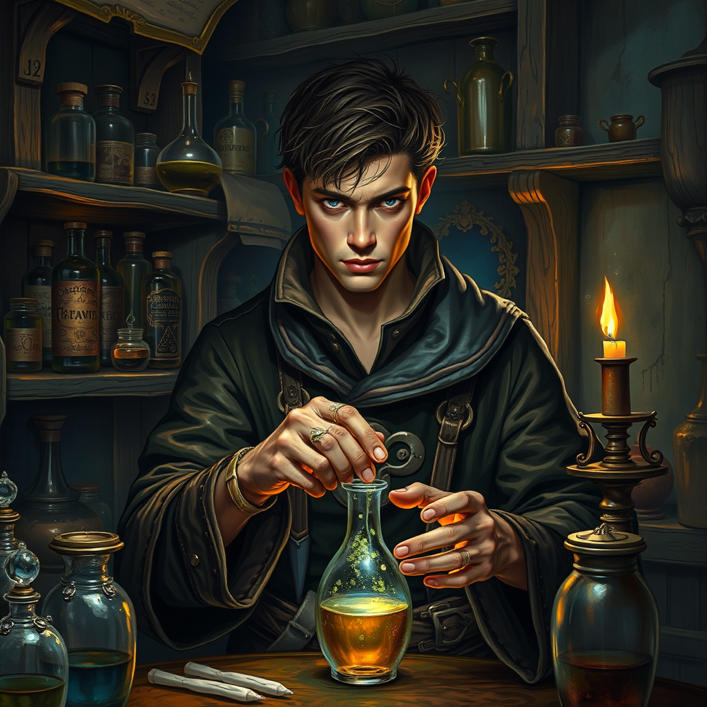 Young male alchemist in a medieval lab, surrounded by potions, depicted in a hyper-realistic painting. He wears a detailed robe with leather accents, set in a dark fantasy environment. The intricate setting includes shelves of mysterious ingredients, a flickering candle casting shadows, and aged wooden furniture. The alchemist is focused, with intense eyes, and his hands skillfully mix a glowing potion. Despite the complexity, the scene maintains clarity and high quality, avoiding any distortions or unnatural elements.