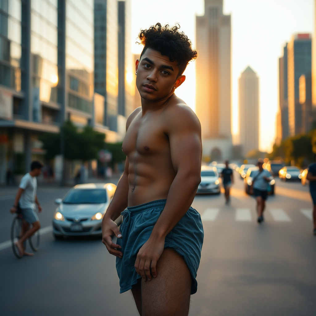 Young man in the bustling city during late afternoon, standing confidently, strikingly handsome and athletic, Mexican American, embodying the essence of Latino culture, dressed in stylish shorts that accentuate his form, devoid of jewelry, possessing flawlessly sculpted hands and an impeccable face. The golden sun illuminates his short, black, curly hair, and its rays cascade over his naturally hairy legs, drawing attention to his bare feet. Captivated in an award-winning portrait photograph, shot on Kodak Portra 800 with a Hasselblad 500C using a 55mm f/1.8 lens. The image boasts an extreme depth of field, utilizing available light to create a high-contrast, Ultra HD, HDR effect, capturing every detail in stunning 8K clarity.