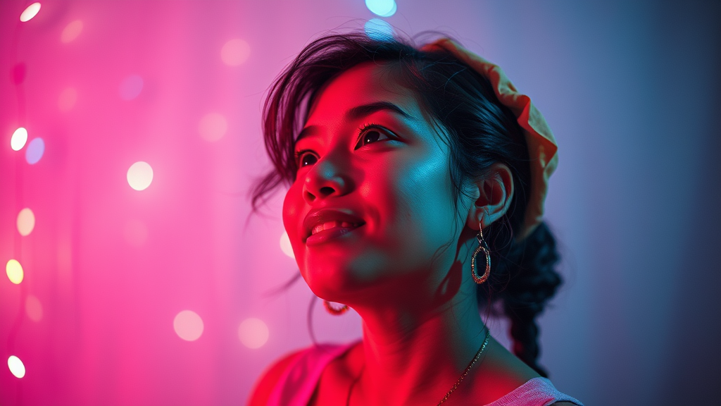young mapuche woman immersed in thought, exuding passion and joy, quirky and vibrant, enveloped in a world of pastel hues, light painting, vivid bokeh effects, hyperspectral details, telephoto depth, electric and fluorescent colors, cinematic film lighting, floating dust particles, and a touch of electricity, artistically post-processed for a captivating 9:16 composition