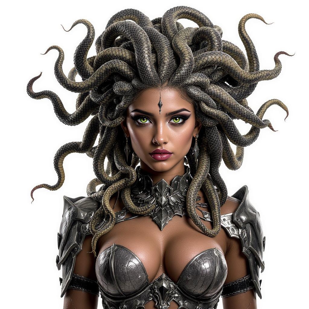 Young Medusa, full body, with an intricate mane of snake hair, captivating green eyes, and a striking female face, adorned in artistic metal armor, trending on art platforms, photographed in a sophisticated studio setting. The image boasts intricate details, particularly noticeable in her expressive eyes, with precise digital rendering. A professional-grade, sharp-focused illustration in 4k quality, emphasizing her mythological allure.