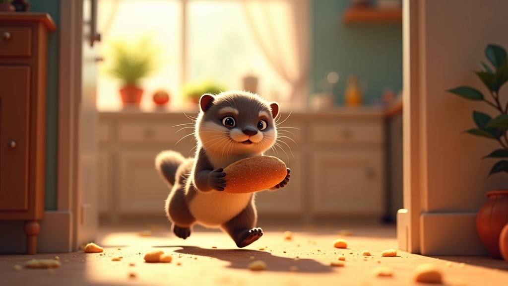 A playful young otter with gleaming eyes and a mischievous grin sneaks through a sunlit kitchen, snatching a fresh loaf of bread from a human table. Its sleek fur glistens as it darts away, leaving a trail of crumbs. The otter's small paws clutch the bread tightly while its whiskers twitch with excitement. In a whimsical, Pixar-inspired style, the scene captures the charm and humor of this cheeky aquatic creature's daring escapade, set against a backdrop of a cozy, brightly-colored kitchen filled with warmth and life.