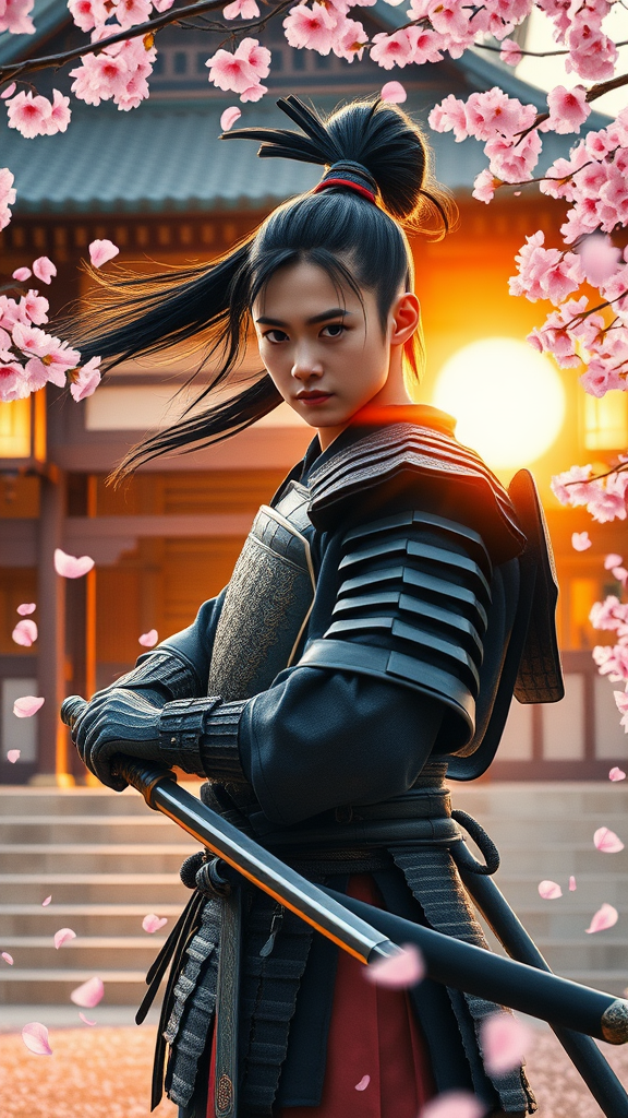 Young Samurai with flowing black hair and a neatly tied ponytail, clad in intricate samurai armor, gripping a katana with a fierce yet serene expression, standing in an ancient Japanese temple surrounded by a shower of cherry blossom petals. The scene is bathed in the warm glow of a glowing sunrise, casting ethereal and tranquil light across the landscape. The temple is softly illuminated by traditional lanterns, casting gentle shadows on the detailed woodwork. This high-detail watercolor painting captures the essence of realism through its ultra-high resolution and pastel colors. The muted tones of the watercolor palette enhance the serene atmosphere, while the sharp focus and cinematic lighting bring the intricate details of the samurai and the delicate beauty of the temple to life, all depicted with the meticulous precision of physically-based rendering, akin to a 35mm lens capturing the moment in time.