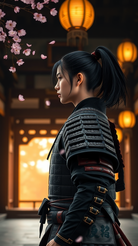 Young Samurai with flowing black hair tied in a ponytail, clad in ornate samurai armor, stands poised within an ancient Japanese temple. Cherry blossom petals gently drift through the air, catching the glow of hanging lanterns. The first light of a glowing sunrise bathes the scene in a serene and ethereal glow. Subtle, delicate shadows dance across the architecture, while dramatic lighting highlights the contours of the scene. Captured as a high-detail RAW color photograph, the image exhibits ultra high resolution with exceptional detail, akin to an 8K wallpaper. Employing physics-based rendering and realistic textures, it presents a hyper-realistic visual akin to professional photography with rich, lifelike colors. The image, reminiscent of hyperrealism, benefits from a cinestill 800 effect, with a depth of field captured through an f1.6 lens, showcasing rich colors and hyper-realistic textures.