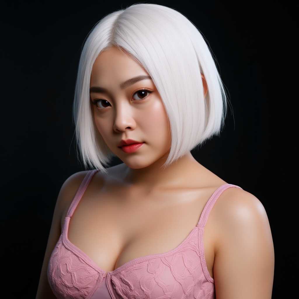 Young South Korean girl with medium-length white hair, wearing pink lingerie, featuring a proportional and toned body. Her face is highly detailed with beautiful eyes, captured in cinematic lighting and depth of field. A professional high-detail RAW color photo is taken with ultra-high resolution and realistic skin textures. Employing hyper-detailed photorealism and best quality, the image is conceived for 8K HD wallpapers. Rendered using physics-based techniques, dramatic lighting, and rich colors akin to Kodak Portra 400 film stock, the portrait offers lifelike texture captured with a Nikon D850 camera using a f1.6 lens. Trending on Artstation and Unreal Engine, the scene showcases a harmonious blend of artistic and photographic excellence.