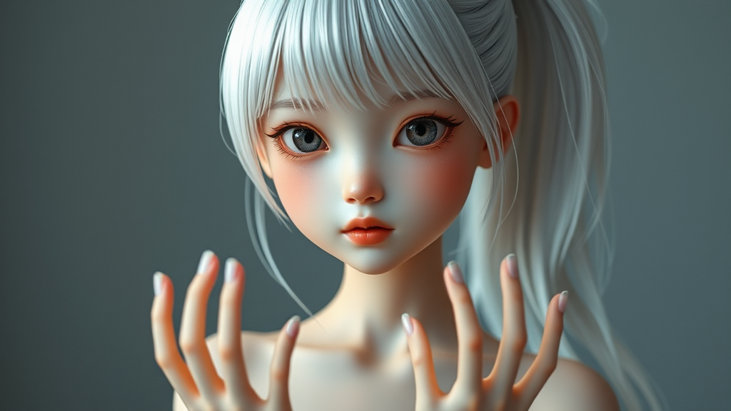 Young South Korean girl with medium-length white hair, beautifully detailed face, captivating eyes, petite and toned physique, cinematic lighting, hands out of view, slightly abstract features, eyes conveying depth, long flowing hair tied in a ponytail, 3D doll-like appearance, rendered with an ethereal quality, unique anatomy, soft focus, ethereal ambiance, artful abstraction with additional limbs, creative interpretation of form, surreal fingers, imaginative portrayal with subtly distorted realism.