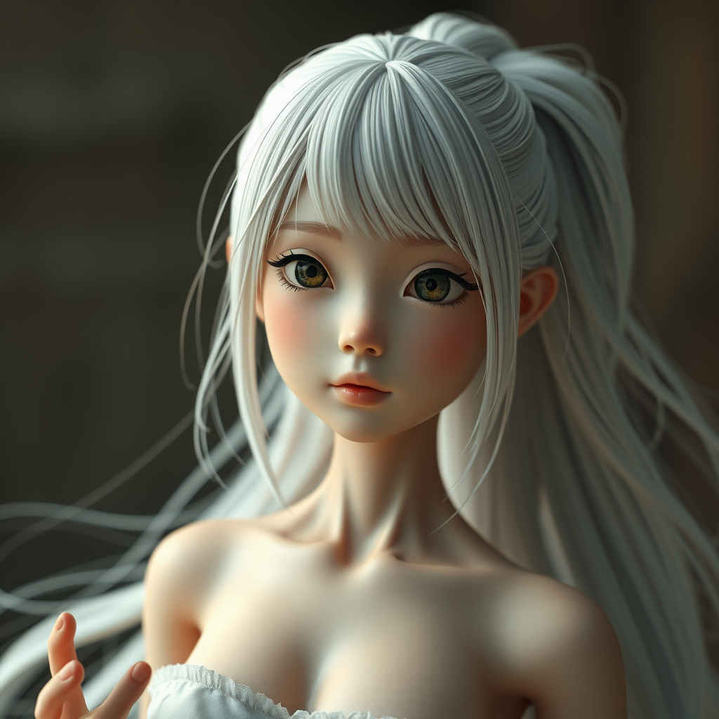 Young South Korean girl with medium-length white hair, detailed face, captivating eyes, small bust, toned physique, cinematic lighting, hands out of frame, intricate facial features, expressive eyes, flowing long hair in a ponytail, 3D render style, doll-like appearance, octane render, unique anatomy, atmospheric blur, surreal elements, abstract forms, imaginative composition, ethereal and dreamlike quality.