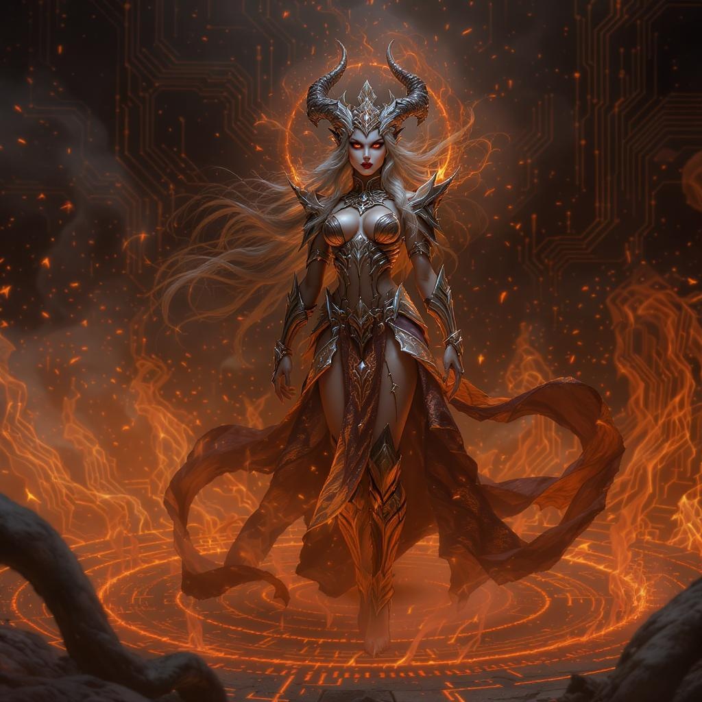 Young, stunning Queen of the Fire standing on a ground shrouded in a spiral of flame-infused mist background, radiating majesty, depicted in full body with ornate attire, a flawless and captivating face, striking a graceful pose; this setting embodies impeccable composition, combining realism with circuit board elements in a fantasy framework. The scene exudes trial dark fantasy vibes, designed for artstation concept. Photorealistic concept art merges with pronounced shadows and dynamic lighting, achieving 8k resolution, ultra-detailed quality with a sharp focus. Rendered with 3D octane capabilities, this imagery is ideal for wallpaper, offering HDR, high quality, and high-definition visuals, stylized to the height of 1000.