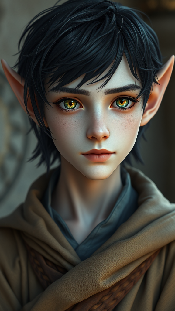 Young white man, ethereal elf-like fae, gracefully elongated ears, skin like pure marble, jet-black hair, mesmerizing green eyes flecked with gold, mystic wizard and wise scribe, dedicated scholar, adorned in an exquisitely beautiful robe, highly detailed features, intricate and expressive eyes, vibrant 8k Pixar-level high resolution, infused with the nuance of Rembrandt lighting, reminiscent of Ghibli studio magic, cinematic and fairy tale ambiance, rendered in striking 4K quality, visual depth with no focus distortion, aspect ratio 9:11.