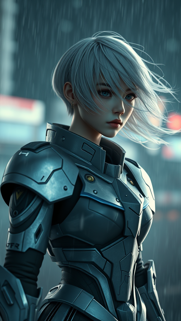 Young woman adorned in Gundam-inspired armor, her cropped white hair flowing with the gusts on a stormy, rain-swept night. She stands solitary, evoking a sense of resilience and solitude. The scene, reminiscent of trending artstation themes, is imbued with intricate details and cinematic grandeur, capturing a masterpiece-like quality. The environment is breathtakingly vivid, with shiny and smoothly rendered textures that exude a surreal, almost divine ambiance. The character embodies a celestial and ethereal presence, blending elements of manga and anime CGI. The 3D rendering is executed with such precision, enhancing her resemblance to a hyper-realistic doll. Despite the dominant gray palette of the night, her presence shines through in an artistic exhibition of light and shadow. The visual narrative conveys a haunting beauty and silent strength, without the flaws and distortions often associated with imperfect digital models or low-quality outputs.