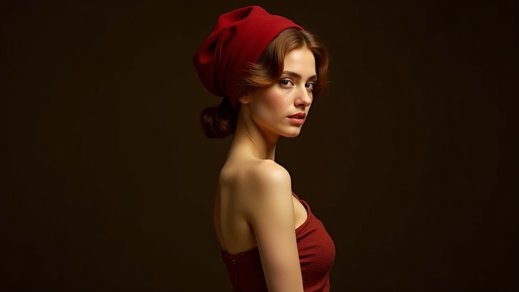 View this AI-generated image featuring young woman adorned with a crimson headscarf poised gracefully balanced composition illuminated softly in a warm golden light reminiscent of the dutch golden age portrait artistry inspired by johannes vermeer. Created using advanced AI technology, this image sh