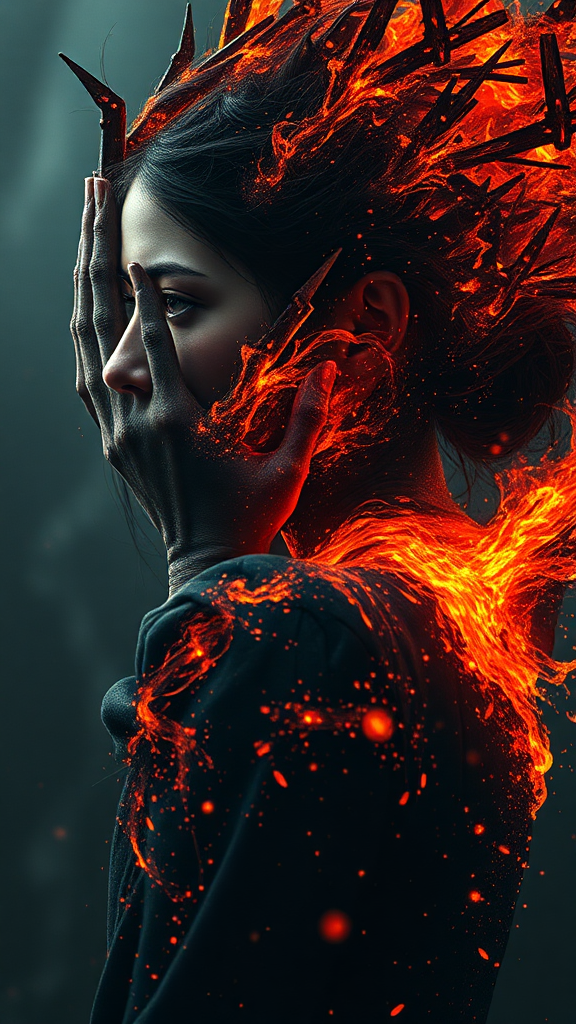Young woman consumed by grief, her eyes hidden by hands made of countless blades, her form slowly transforming into flowing magma, disintegrating and merging with the earth, fragments of her essence evaporating into the air, captured in an exquisite side profile, set in a dark, hyper-detailed scene reminiscent of unreal engine, haunting yet beautiful, embodying chaos and transcendence.