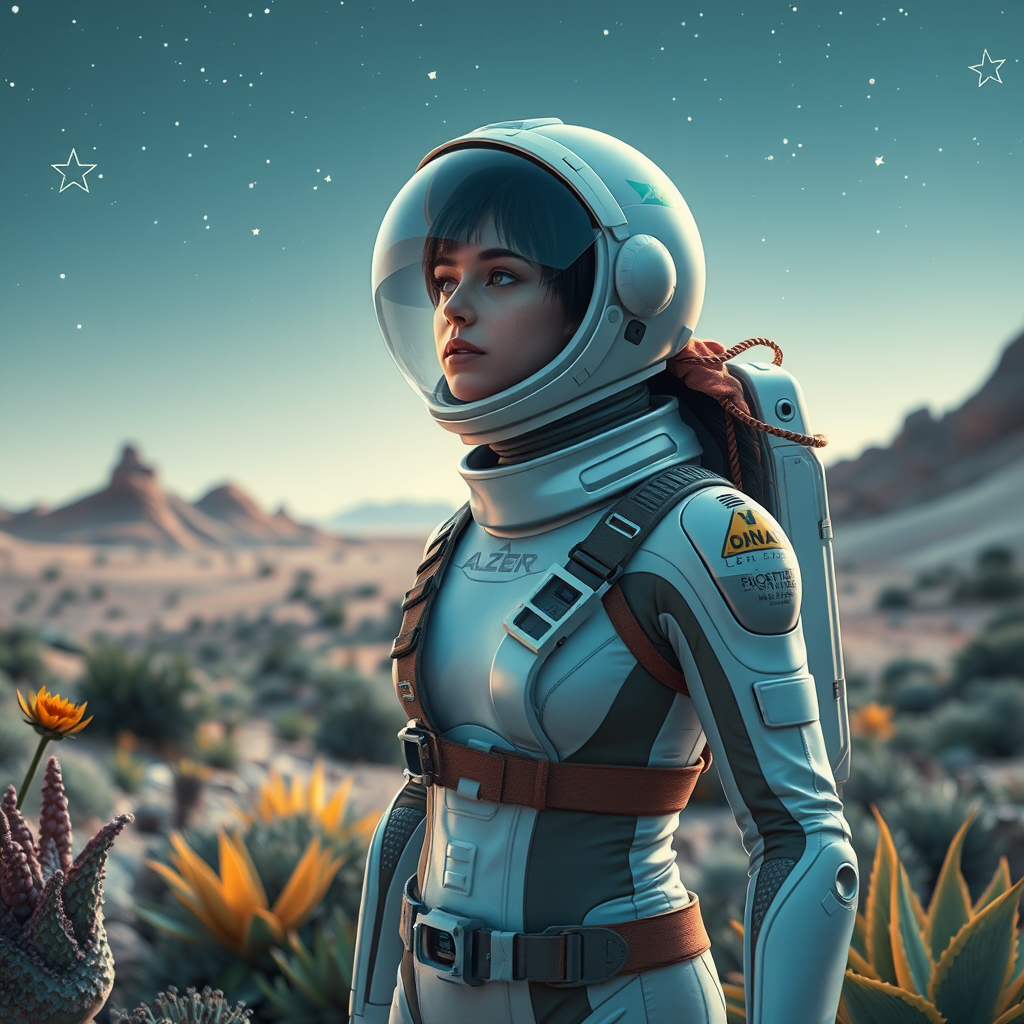 Young woman exploring an alien landscape in a sleek, futuristic spacesuit with a reflective visor, surrounded by distant stars and strange, colorful plants.