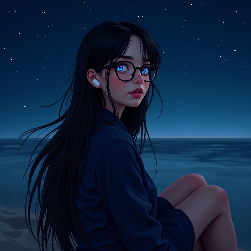 A stunning young woman with long flowing hair and blue eyes sits quietly on the beach, wearing glasses and AirPods. Her elegant and symmetrical features exude a gentle grace as she gazes into the distance under a starry night sky. The scene is captured in hyper-detail with glowing, vibrant colors and natural lighting that enhances her serene presence. The portrait is set against the vast, intricate landscape of the beach, utilizing a wide-angle perspective enhanced with 16k resolution and RTX ray tracing lighting for the highest quality. The intricate design and thoughtful composition create a captivating image of depth and vision.