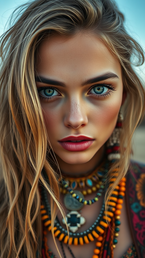 Young woman gazing directly into the camera, featuring intricate details and vibrant colors, captured in 8k resolution. She has flowing long hair, expressive big eyes, and full, striking lips. Her style is a fusion of Coachella and Burning Man aesthetics, radiating a free-spirited, bohemian vibe with elements inspired by the hippie culture. Her attire is eclectic, adorned with colorful patterns and accessories that reflect a festival atmosphere, exuding an aura of artistic individuality and creative expression.