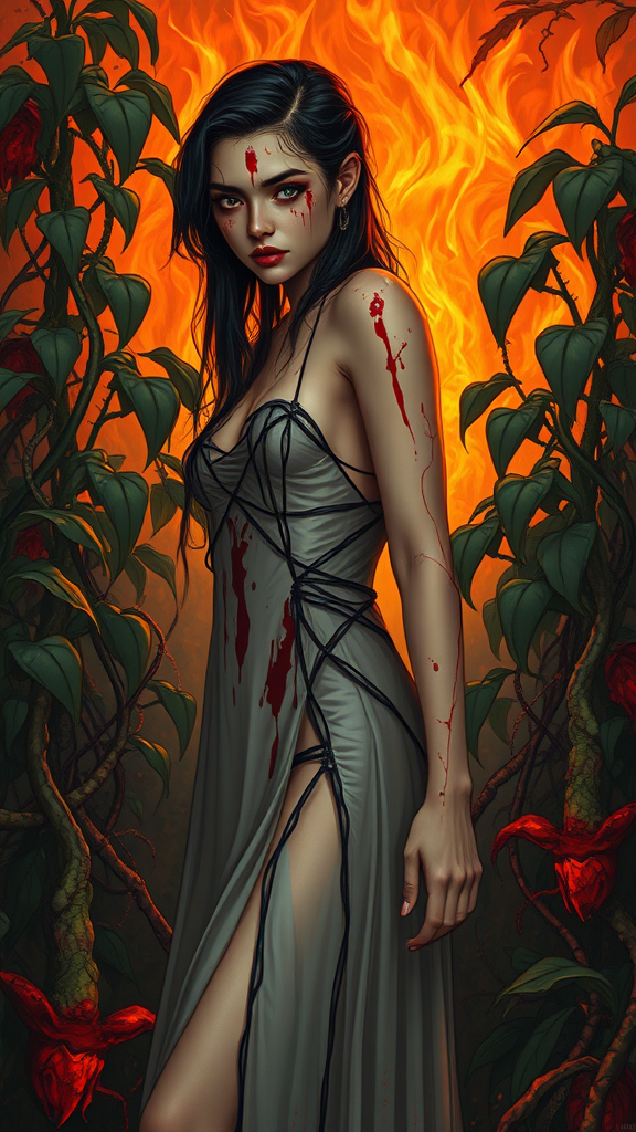 Young woman in a high-slit gown with dark veins resembling dripping oil, surrounded by carnivorous plants and entwining ivy, her face appears melancholic with accents of red splatters and streaks, all set against a fiery backdrop. This scene is captured in a detailed illustration that embodies elements of fine art, rendered in 8K quality with a dramatic interplay of rim, artificial, and cinematic lighting.