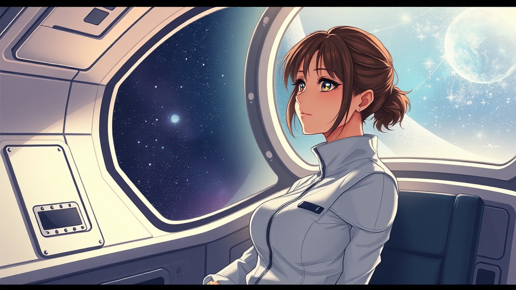 young woman in a sleek white jumpsuit gazing out the window of a spaceship, anime-inspired digital art, enhanced colors, detailed textures, smooth lines, expressive eyes, futuristic setting with stars visible through the window, serene and thoughtful expression, high-quality illustration with attention to anatomy and proportions, dynamic pose with emphasis on the vastness of space, elegant and captivating ambiance