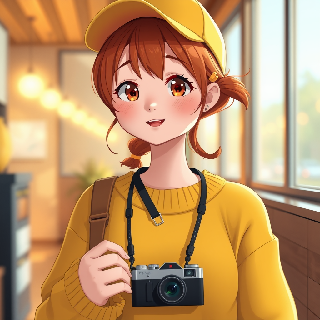 Young woman in her mid-twenties with ginger hair, a camera around her neck, wearing a cozy yellow sweater and matching baseball cap, designed in the enchanting style inspired by Kentaro Miura. The scene is lit with beautiful, natural, volumetric lighting. She appears in a charming CGI animation, radiating a cute and playful vibe, with 3D doll-like features rendered in high-quality octane. The artwork is a blend of cartoon and anime influences, meticulously crafted in digital art and painting. The character has proportionate anatomy, a beautifully drawn face, and expressive hands, seamlessly integrated within the frame, showcasing her lively spirit and adventurous nature.