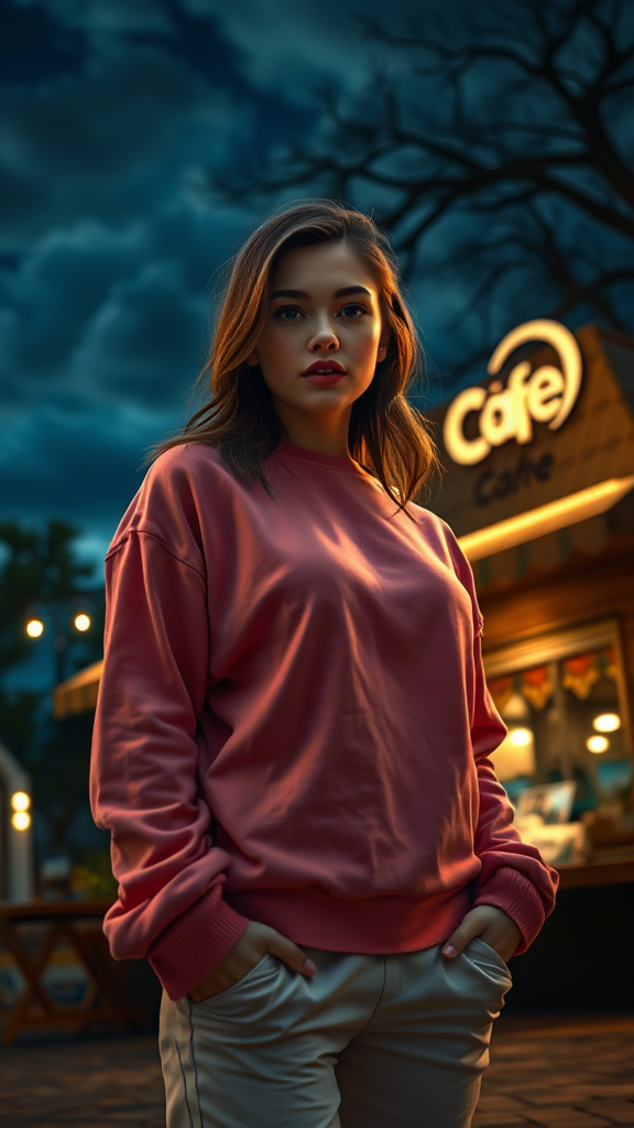 Young woman standing alone under a captivating night sky, full body view, wearing a pink sweatshirt, white sneakers, and a jacket. She stands confidently outside a charming, intricately detailed cafe. Her gaze is directed towards the viewer, her eyes and lips exceptionally detailed, framed by professional, cinematic lighting that highlights her facial features. The scene employs advanced lighting techniques like photon mapping, radiosity, and physically-based rendering, ensuring an ultra-realistic and lifelike representation. The ambience is serene, with a blend of warm lights and shadows casting soft glows on her face. The scene avoids imperfections such as unusual limb or finger proportions, ensuring a polished and visually pleasing composition.