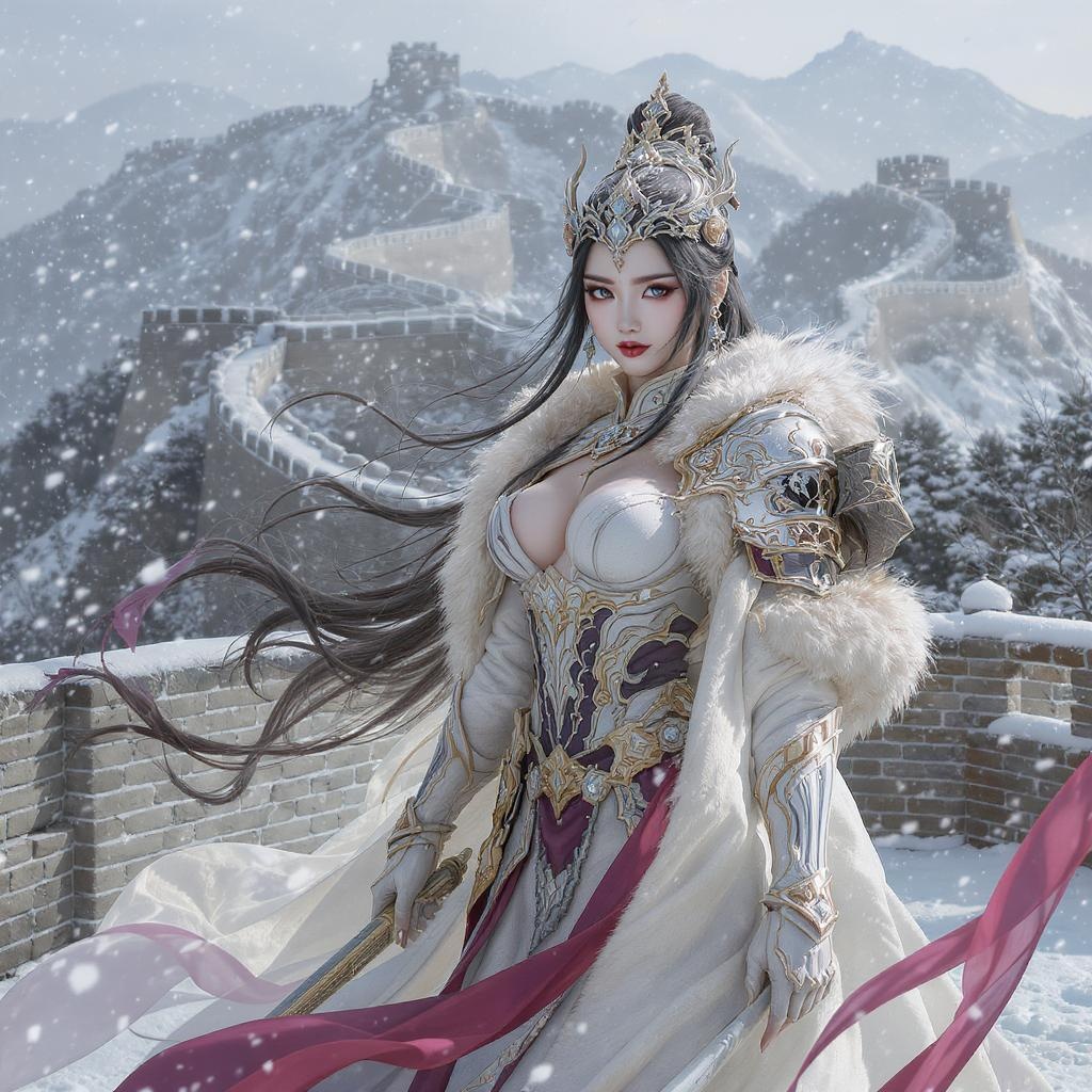 young woman, stunning detail, high resolution, realistic art style, inspired by fanyangli, generous curves, intricate armor, pale linen garments, flowing cape, luxurious fur-trimmed coat, daytime setting, dark flowing hair, wintery snowflakes, majestic Great Wall backdrop
