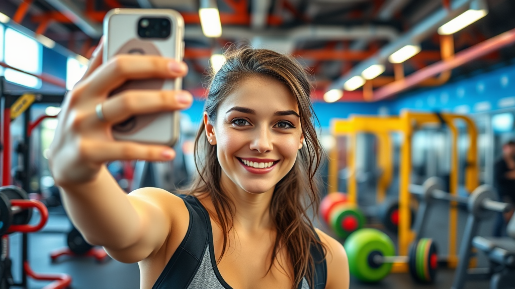 Young woman taking a selfie at a vibrant gym, surrounded by colorful workout equipment; she has a relaxed smile and confident posture, capturing the lively atmosphere with a hint of determination in her eyes. Her athletic wear is trendy and functional, enhancing her energetic vibe, while subtle lighting highlights the dynamic environment, fostering a sense of vitality and motivation.