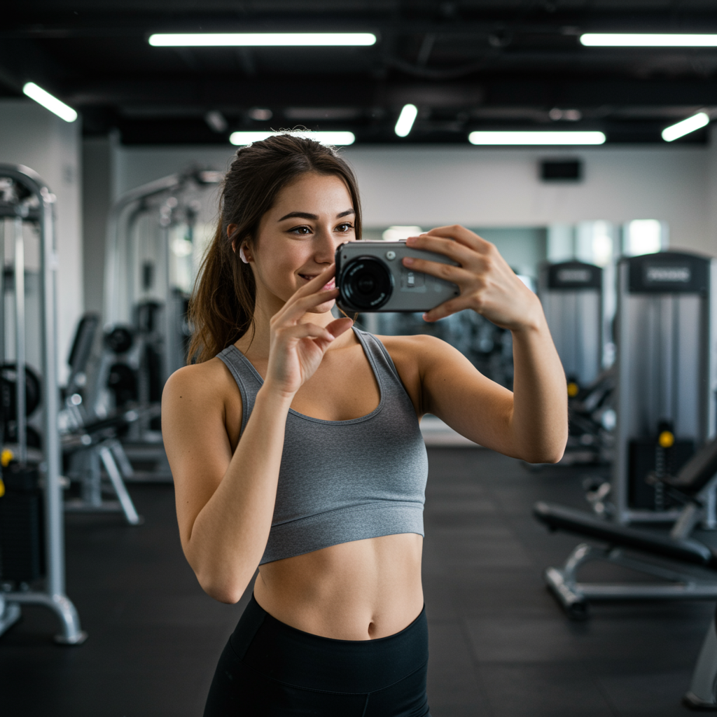 young woman taking a selfie in a fitness center with vibrant energy, minimalist background, exercise equipment subtly visible in the distance, ensuring focus on the girl, soft lighting enhancing natural features, no visible logos or text, atmosphere of health and positivity