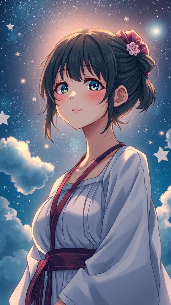 Young woman wearing delicate attire, inspired by artist Oyari Ashito, stands against a starlit sky, nighttime aura, evocative portrait celebrating joy and contentment, imbued with manga and anime artistry, drawn with deep shadows and vivid hues, striving for unparalleled quality and precision, captured from a close perspective, enhanced by dark contrasts and luminous shades, surrounded by gentle clouds, --ratio 9:16.