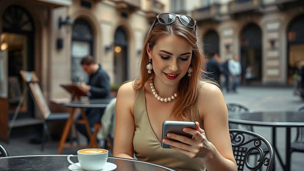 Young woman wearing pearl earrings, modern digital photo in an Italian piazza, relaxing at an outdoor café, engrossed in her smartphone, cappuccino on the table with a street artist sketching in the background buzzing-cafe-italy-2023.