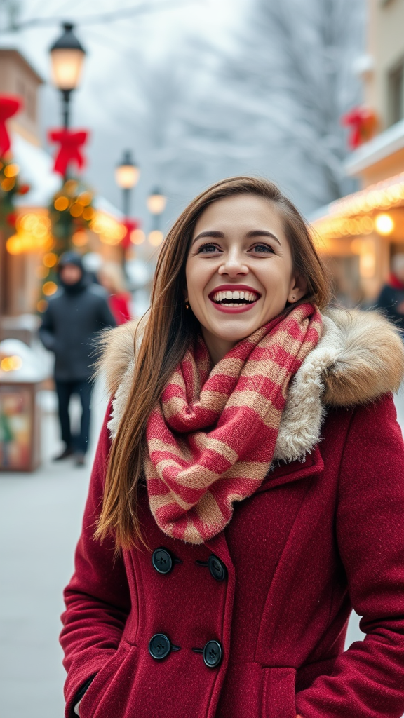 young woman, winter coat, festive holiday atmosphere, snowy background, warm laughter in the air