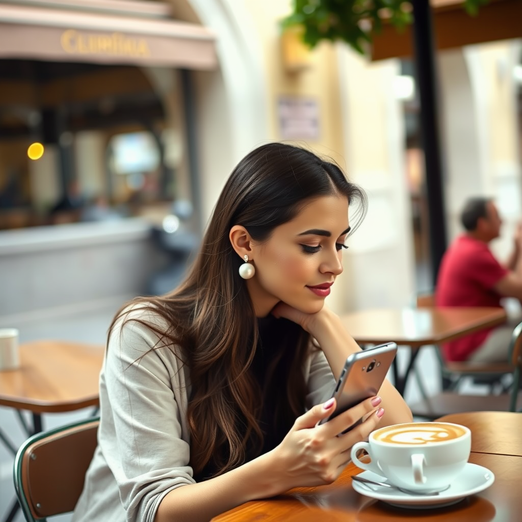Young woman with a pearl earring modern digital photograph, in Italy, relaxing at an outdoor cafe glancing at her smartphone, cappuccino on the table casual-day-vibe-2101.