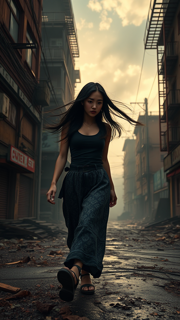 Young woman with flowing hair, of Chinese descent, in mid-stride, depicted in ultra-detailed digital art. The scene is illuminated with web movie-quality lighting, crafted with expert studio finesse. Rendered using cutting-edge technology like Unreal Engine 5 and Sinting, capturing cinematic textures. She walks through a rusty dystopian landscape—streets that tell tales of decay, framed by smoke-laden skies and crumbling urban sprawl. The atmosphere is charged with moody, cloud-lit fantasy elements, creating tension through dramatic lighting yet softened with meticulous detail. This filmic illustration employs advanced ray tracing for impeccable clarity and focus. Presented in breathtaking 8k HD, this ultra-wide composition pulls you into a world of desolation and beauty.