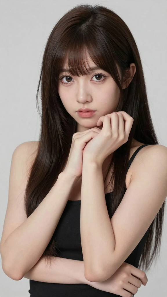A beautiful young woman with long, dark hair and bangs gazes directly at the viewer. She wears a simple black top, her hands clasped gently in front of her, conveying a serene and thoughtful mood.