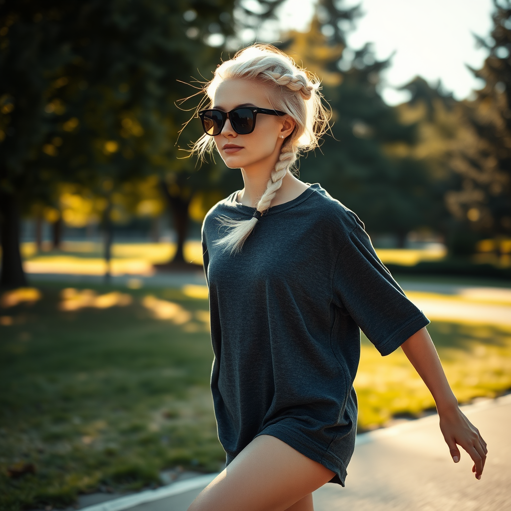 Young woman with platinum blonde hair styled in a loose braid, sporting oversized sunglasses and an oversized charcoal T-shirt, gliding effortlessly on a skateboard through a serene park setting, captured in stunning detail with a Canon EOS-1D, f/5, photorealistic quality, with a golden afternoon light casting soft shadows on the landscape.