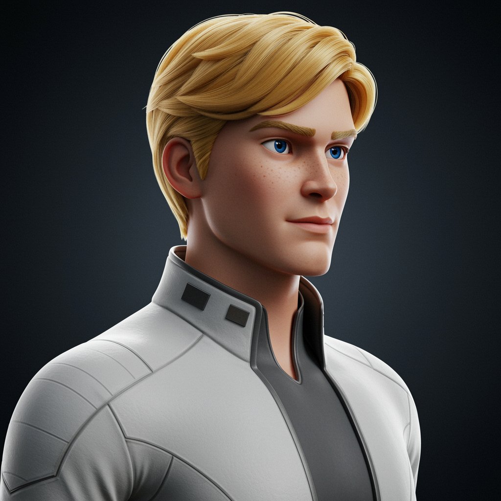 Youthful Fred from Scooby-Doo, portrait style, wearing a sleek white jacket, with golden blonde hair, exuding strength and confidence, captured in sharp focus, digital art creation, focused on a single subject, innovative concept art with cinematic lighting, intricately detailed render, capturing the essence of adventure and leadership.