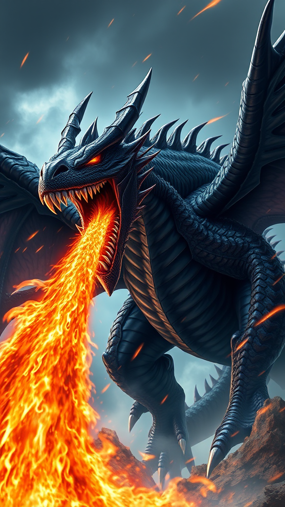 Zoddrened, the formidable black dragon, poised in mid-air with jaws wide open, about to unleash a torrent of searing flames; a breathtaking masterpiece of immense proportions depicted in the style of a hyper-realistic, detail-rich Yu-Gi-Oh! monster. The scene captures every intricate scale and sinister grin, emphasizing the overpowering presence and ominous aura of the dragon. The background hints at a stormy sky, adding a dramatic flair, while streaks of firelight dance across the dragon's dark, shimmering hide, highlighting its majestic and terrifying stature.
