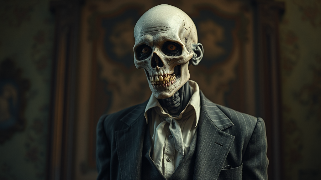 Zombie half-decomposed male specter dressed in a tattered vintage suit, art inspired by Annie Leibovitz, full-body portrayal, striking bone structure, character study, gothic style, cinematic illumination, lightroom ambiance, intricately detailed.