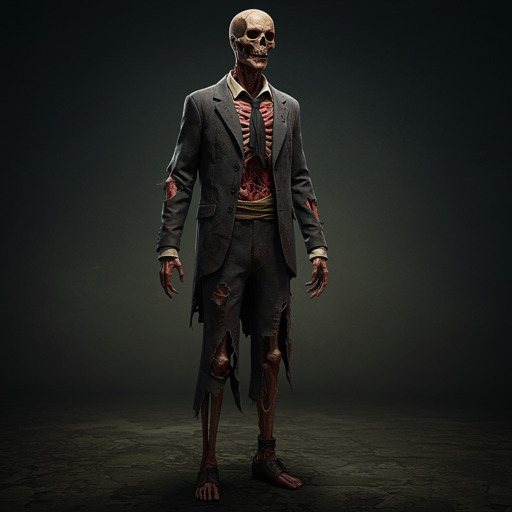 zombie partially decayed male phantom in a tattered vintage suit art by Annie Leibovitz full body view striking skeletal features character portrait gothic aesthetic dramatic lighting lightroom intricately detailed