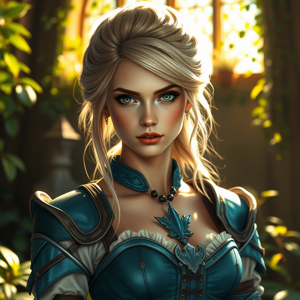 Zrpgstyle portrait of a stunning girl, solo and alone, depicted as a medieval RPG character. She features intricate blonde hair styled in an elegant upsweep updo. Portrayed as a swashbuckling rogue, she wears a corset shirt paired with striking teal armor. Set indoors with an atmosphere of overgrown greenery, the scene is illuminated by bright morning light streaming in from the side, casting a warm glow across her determined face.