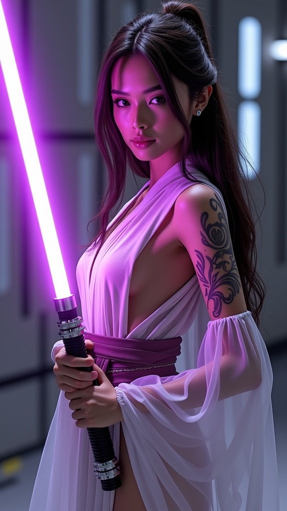 Realistic Photorealistic Perfect Anatomy Futuristic Warrior Wielding Purple Lightsaber 1